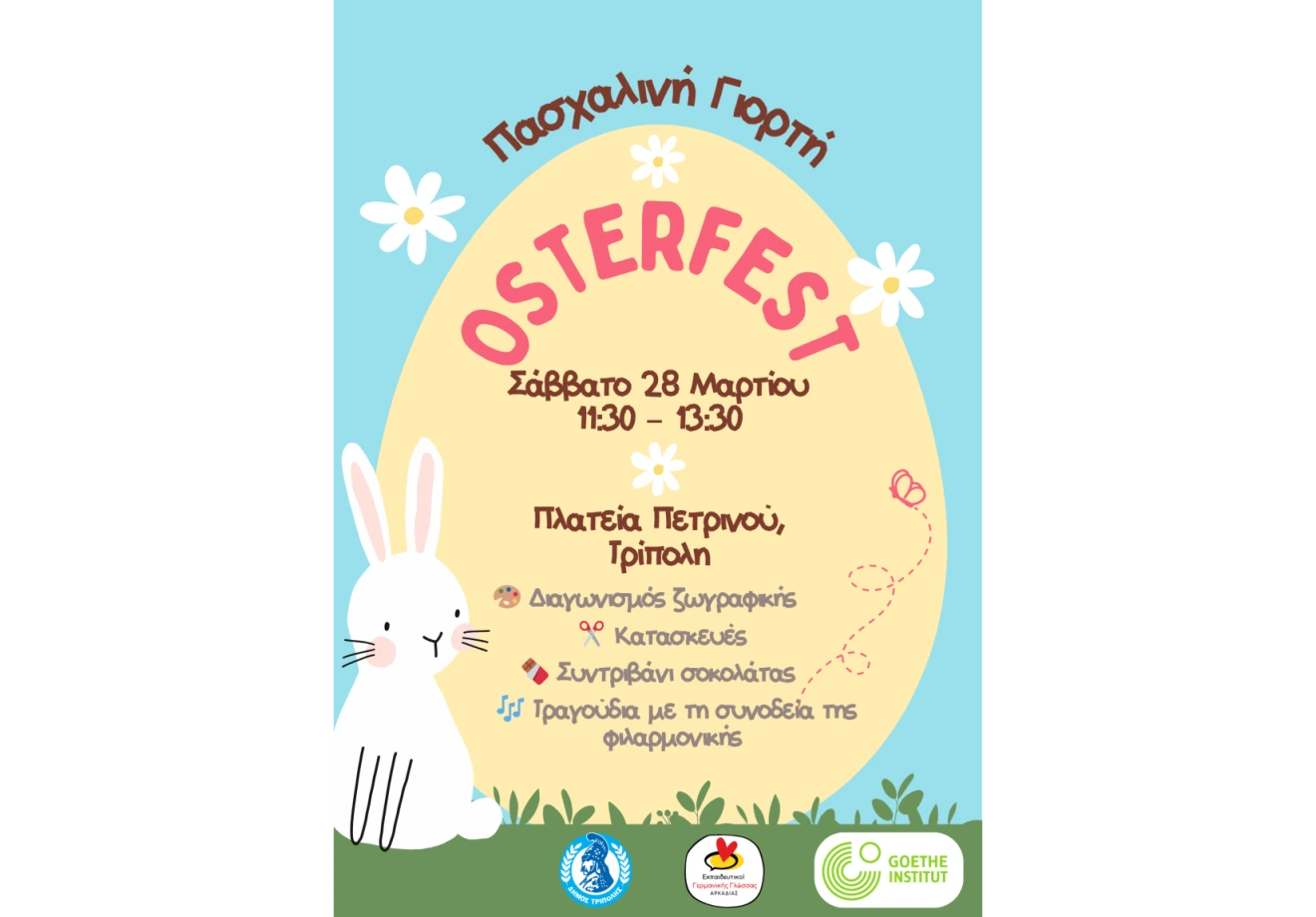 Ο Δήμος Τρίπολης, σε συνεργασία με το Goethe-Institut Athen και τις εκπαιδευτικούς Γερμανικών, προσκαλεί όλα τα παιδιά ηλικίας 5 έως 18 ετών να συμμετάσχουν σε έναν ξεχωριστό διαγωνισμό ζωγραφικής γεμάτο δημιουργία και πασχαλινή έμπνευση.