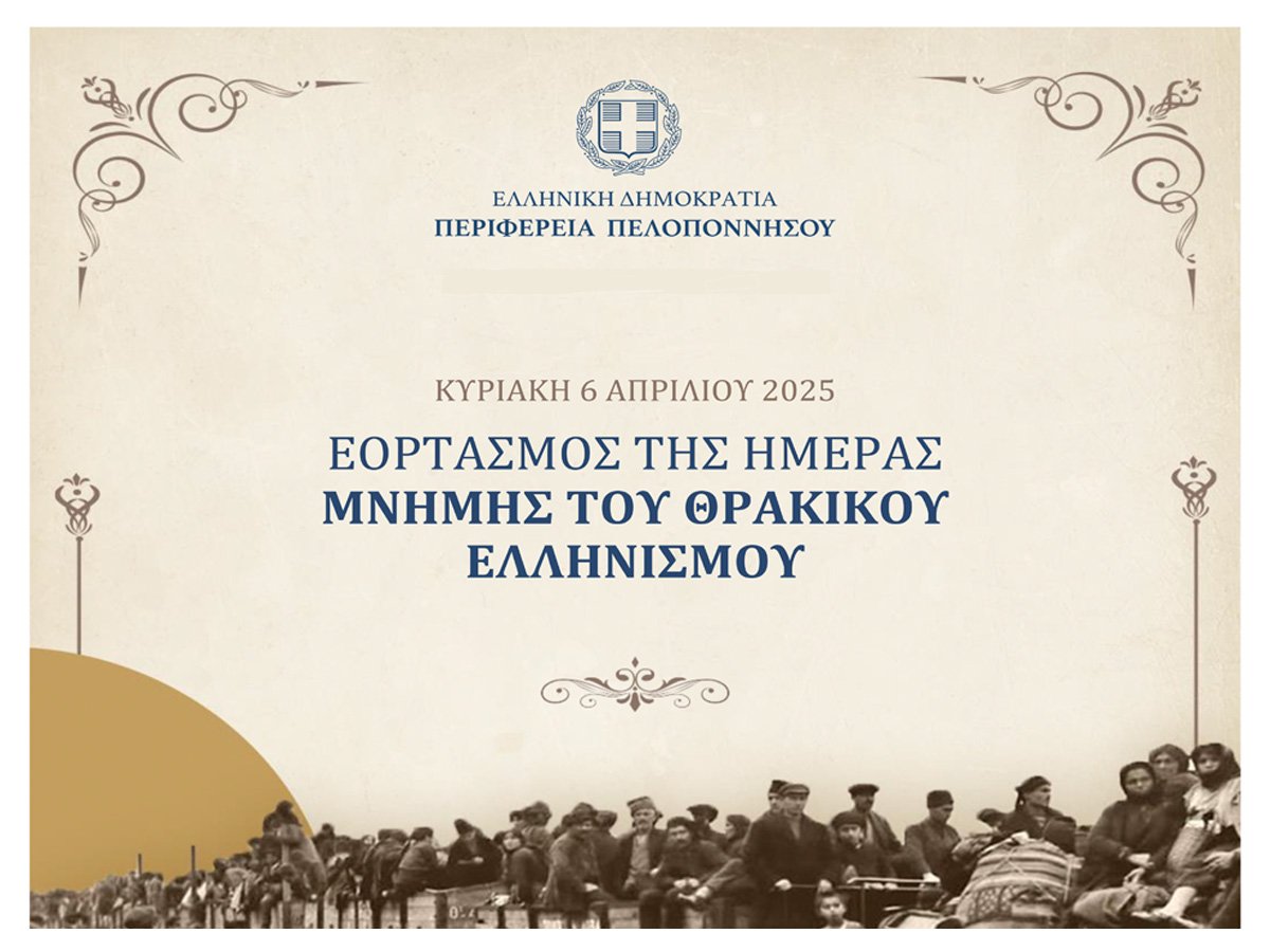 Η Περιφέρεια Πελοποννήσου, με σεβασμό στην ιστορική αλήθεια και τη διατήρηση της συλλογικής μνήμης, διοργανώνει εκδηλώσεις σε όλες τις Περιφερειακές Ενότητες, με στόχο την ανάδειξη της ιστορίας, του πολιτισμού και της προσφοράς του Θρακικού Ελληνισμού στον εθνικό κορμό.