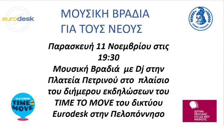 Μία μουσική Βραδιά με Dj στην Πλατεία Πετρινού, στο πλαίσιο του διήμερου εκδηλώσεων του TIME TO MOVE του δικτύου Eurodesk στην Πελοπόννησο.