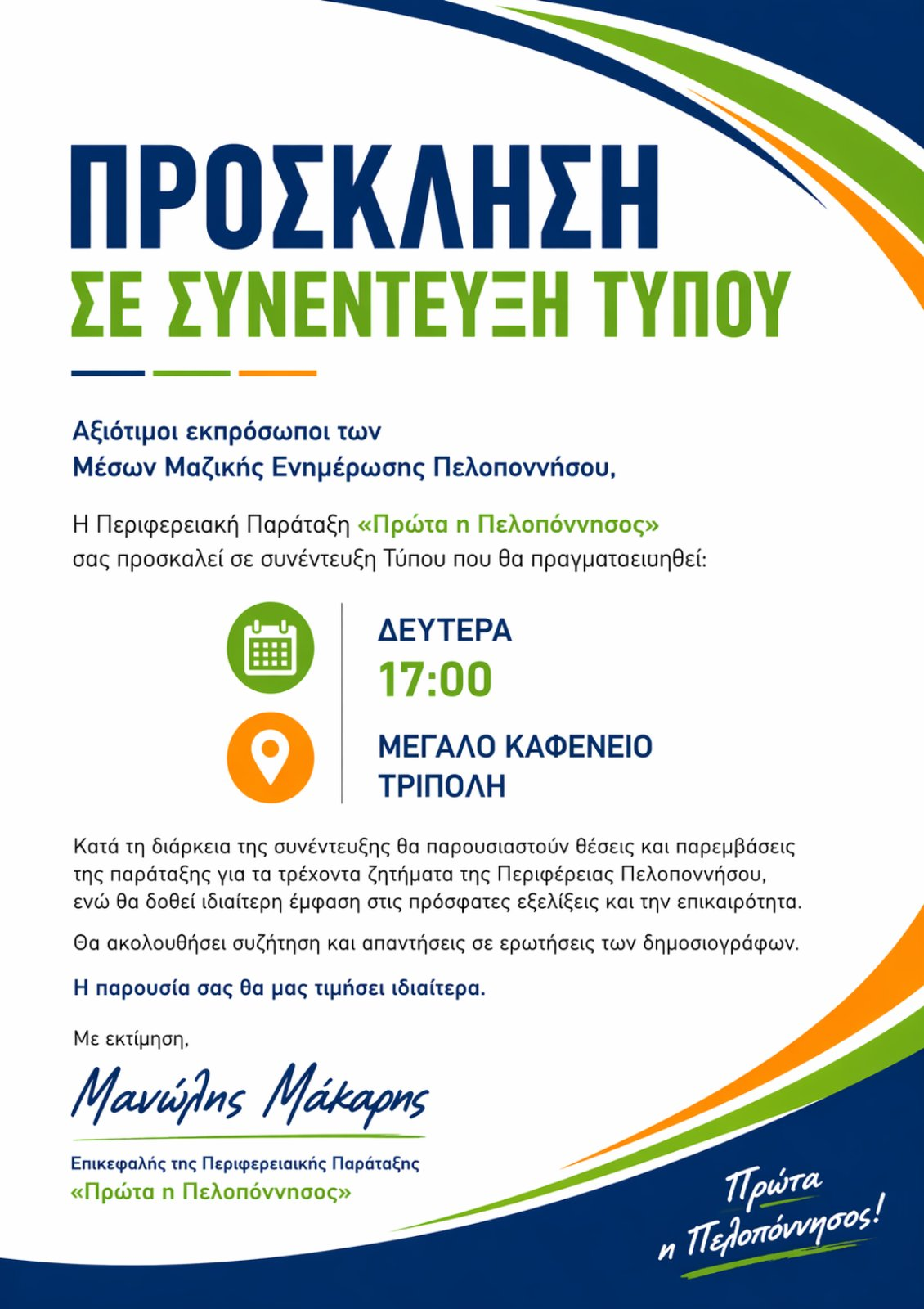 Η Περιφερειακή Παράταξη «Πρώτα η Πελοπόννησος» σας προσκαλεί σε συνέντευξη Τύπου που θα πραγματοποιηθεί τη Δευτέρα 27/04 και ώρα 17:00, στο Μεγάλο Καφενείο στην Τρίπολη.