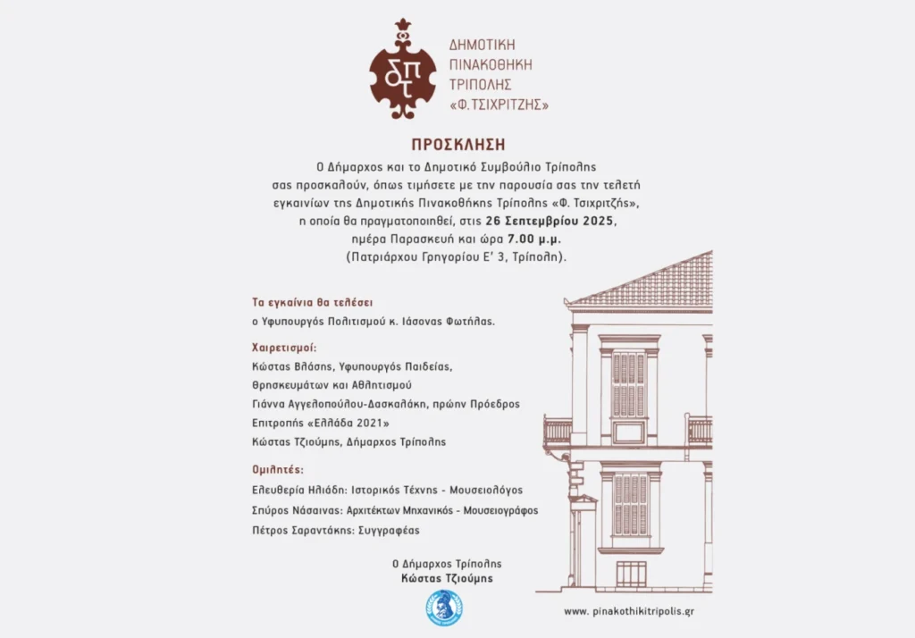 Ο Δήμαρχος και το Δημοτικό Συμβούλιο Τρίπολης σας προσκαλούν, όπως τιμήσετε με την παρουσία σας την τελετή εγκαινίων της Δημοτικής Πινακοθήκης Τρίπολης «Φ. Τσιχριτζής», η οποία θα πραγματοποιηθεί, στις 26 Σεπτεμβρίου 2025, ημέρα Παρασκευή και ώρα 7.00 μ.μ. (Πατριάρχου Γρηγορίου Ε’ 3, Τρίπολη).