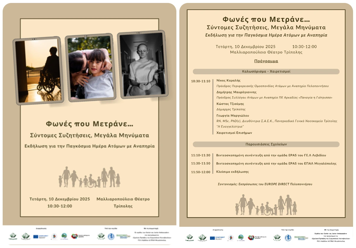 Η Περιφερειακή Ομοσπονδία Ατόμων με Αναπηρία Πελοποννήσου, το ΕUROPE DIRECT Πελοποννήσου, ο Σύλλογος Ατόμων με Αναπηρία ΠΕ Αρκαδίας «Παναγία η Γιάτρισσα», η Διεύθυνση Δευτεροβάθμιας Εκπαίδευσης Αρκαδίας και η ΣΑΕΚ Νοσηλευτικής του Παναρκαδικού Νοσοκομείου Τρίπολης σας προσκαλούν στην εκδήλωση με τίτλο «Φωνές που Μετράνε… Σύντομες Συζητήσεις, Μεγάλα Μηνύματα» η οποία θα πραγματοποιηθεί την Τετάρτη 10 Δεκεμβρίου 2025 στο Μαλλιαροπούλειο Θέατρο Τρίπολης και ώρα 10:30με στόχο να τιμήσει την Παγκόσμια Ημέρα Ατόμων με Αναπηρία.
