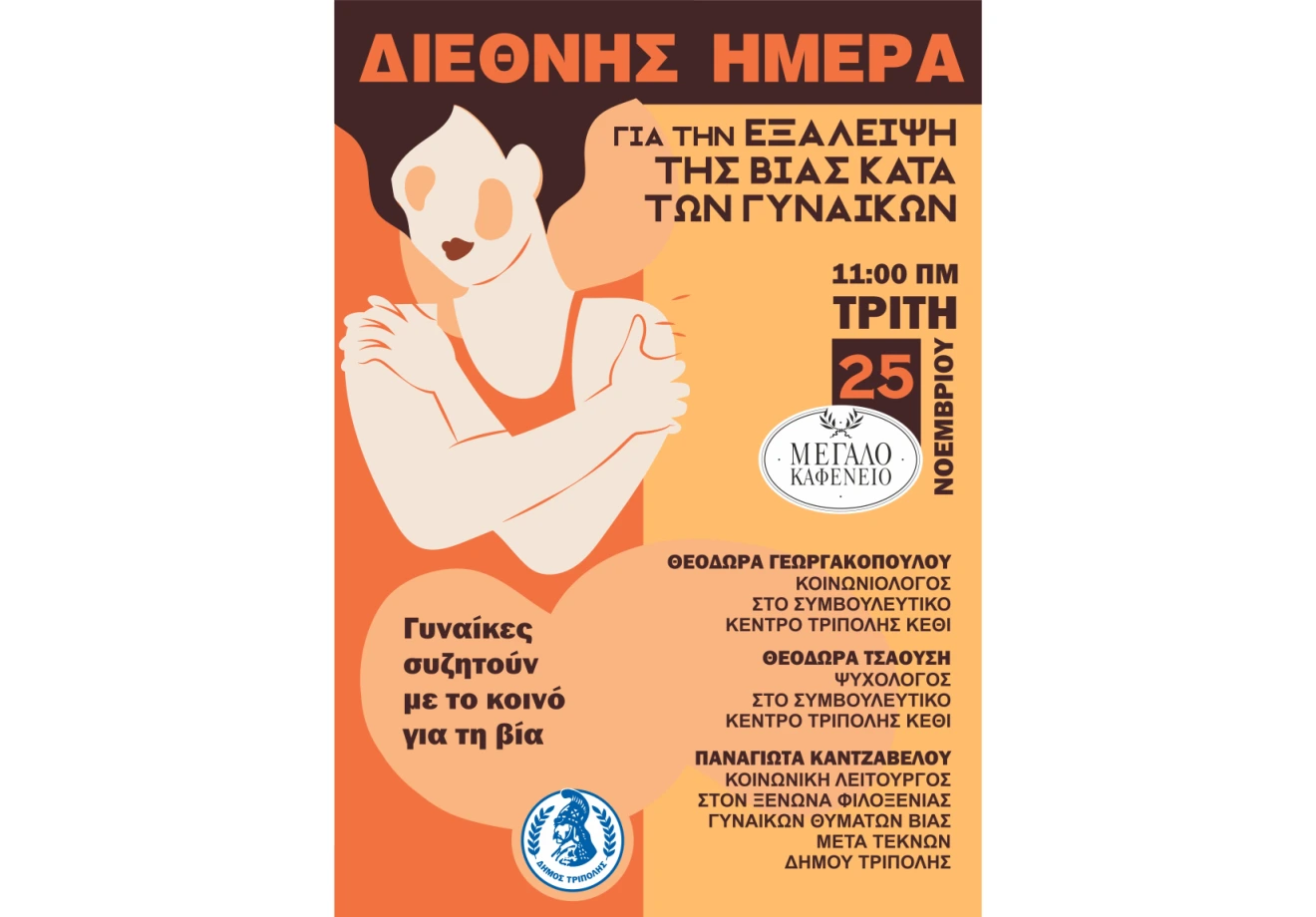 Ο Δήμος Τρίπολης, τιμώντας τη Διεθνή Ημέρα για την Εξάλειψη της Βίας κατά των Γυναικών, διοργανώνει την Τρίτη 25 Νοεμβρίου, στις 11:00 π.μ., μια ανοικτή συζήτηση στο «Μεγάλο Καφενείο», με κεντρικό μήνυμα «Γυναίκες συζητούν με το κοινό για τη βία».