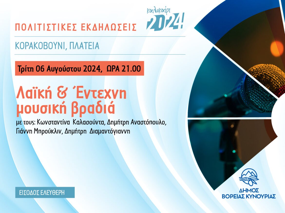 Συνεχίζονται οι καλοκαιρινές Μουσικές Βραδιές του Δήμου ΒόρειαςΚυνουρίας! Την Τρίτη 6 Αυγούστου 2024 και ώρα 21:00 στην κεντρική πλατεία τηςΚοινό […] -