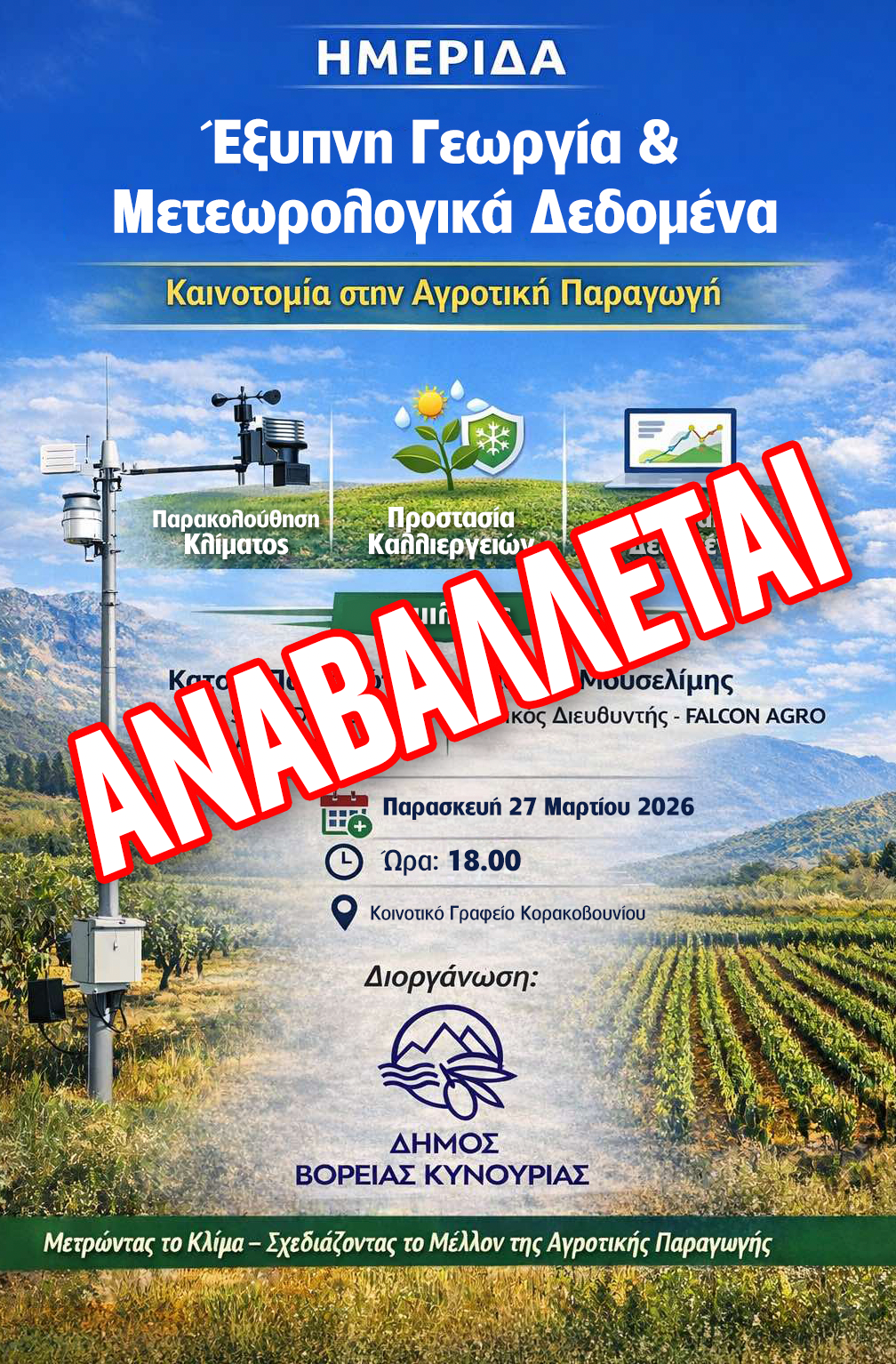 Αναβολή της ημερίδας: «Έξυπνη Γεωργία & Μετεωρολογικά Δεδομένα – Καινοτομία στην Αγροτική Παραγωγή»