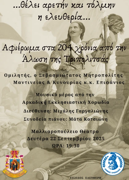 Εκδήλωση με τίτλο «…θέλει αρετήν και τόλμην η ελευθερία…» Εκδήλωση με τίτλο «…θέλει αρετήν και τόλμην η ελευθερία…» συνδιοργανώνεται από την Ιερά Μητρόπολη Μαντινείας & Κυνουρίας, το Δήμο Τρίπολης και τ […]