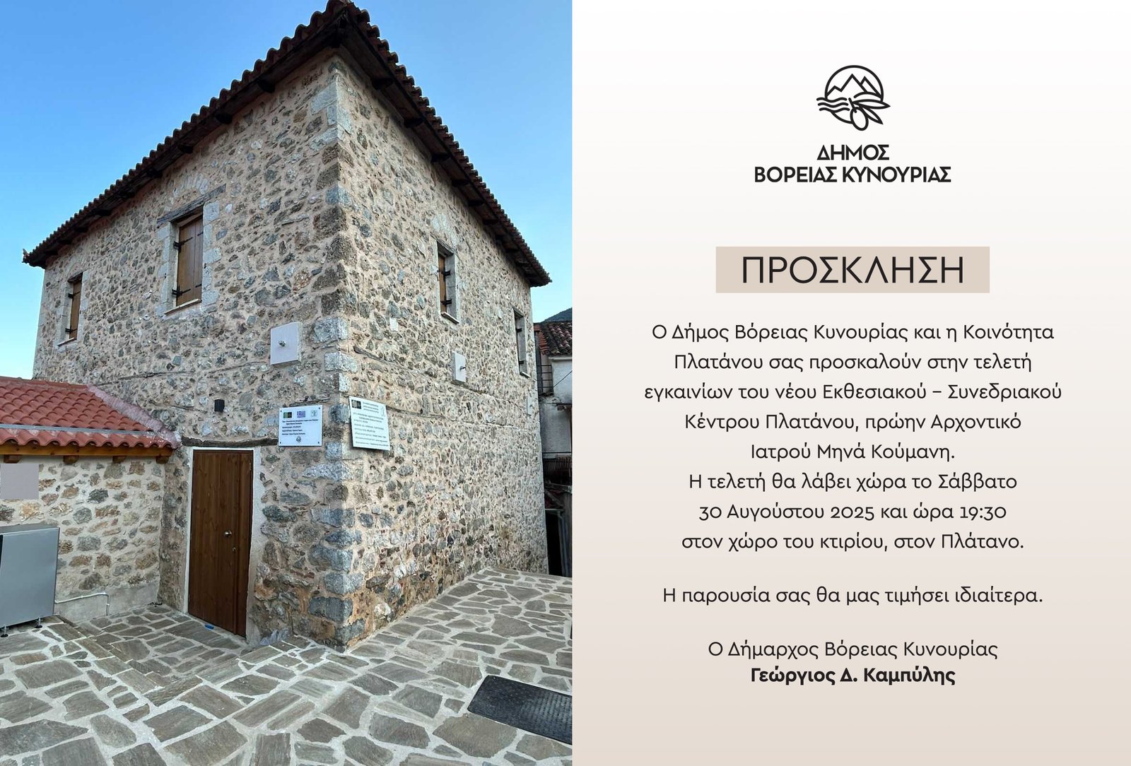 Ο Δήμος Βόρειας Κυνουρίας και η Κοινότητα Πλατάνου σας προσκαλούν στην τελετήεγκαινίων του νέου Εκθεσιακού – Συνεδριακού Κέντρου Π […] -