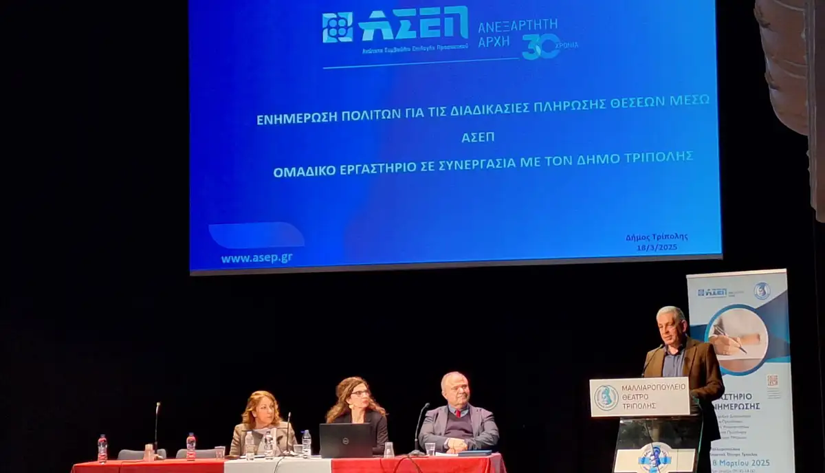 Ομαδικό ενημερωτικό εργαστήριο για τις διαδικασίες προσλήψεων οργάνωσαν ο δήμος Τρίπολης και το ΑΣΕΠ, την Τρίτη 18 Μαρτίου 2025, στο Μαλλιαροπούλειο Δημοτικό Θέατρο